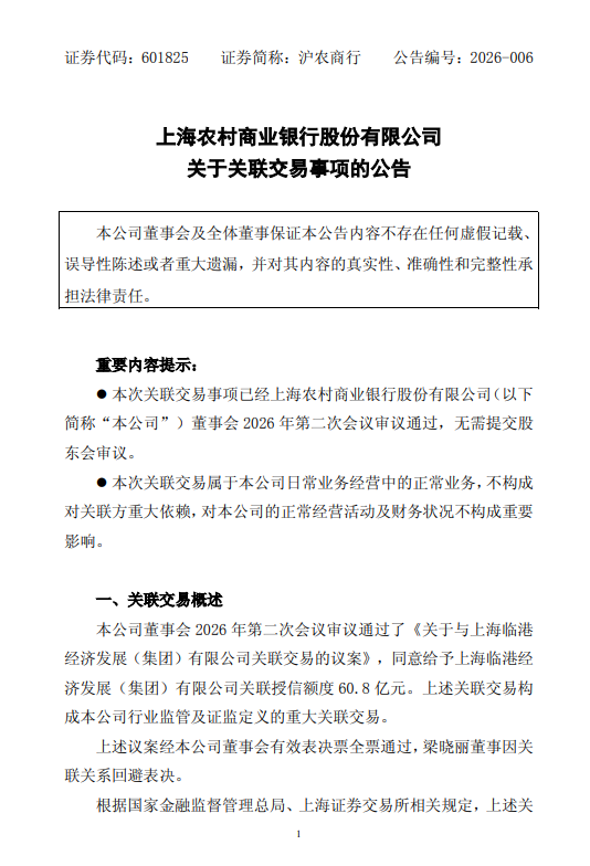 经济发展(集团)有限公司关联授信额度60.8亿元。公告显示,临港集团为沪农商行董事担任董事的企业,属于沪农商行行业监管及证监定义的关联方。
