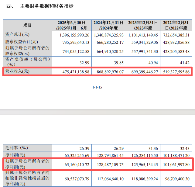 2022年至2024年及2025年上半年,隆源股份的营业收入分别为5.19亿元、6.99亿元、8.69亿元及4.75亿元,归母净利润分别为1.01亿元、1.26亿元、1.28亿元及6516.04万元。