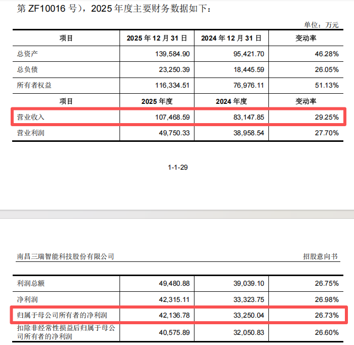 招股意向书显示,受益于无人机及机器人行业的市场需求旺盛,三瑞智能经审计机构审阅的2025年全年营业收入为10.75亿元,同比增长29.25%;归母净利润为4.21亿元,同比增长26.73%。