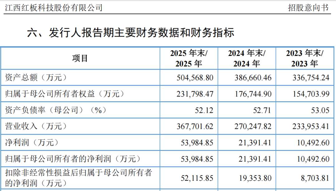 2023年至2025年,红板科技的营业收入分别为23.40亿元、27.02亿元、36.77亿元,净利润分别为1.05亿元、2.14亿元、5.40亿元。