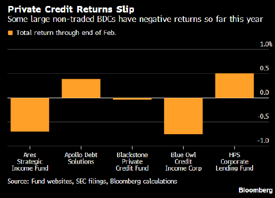 彭博基于监管文件计算显示,非上市业务发展公司Blue Owl Credit Income Corp.在2月下跌0.86%。官网显示,规模260亿美元的HPS Corporate Lending Fund当月下跌0.3%。对这两只基金而言,这也是自2022年以来最差单月表现,与杠杆贷款市场创该年以来最大单月跌幅的趋势相吻合。