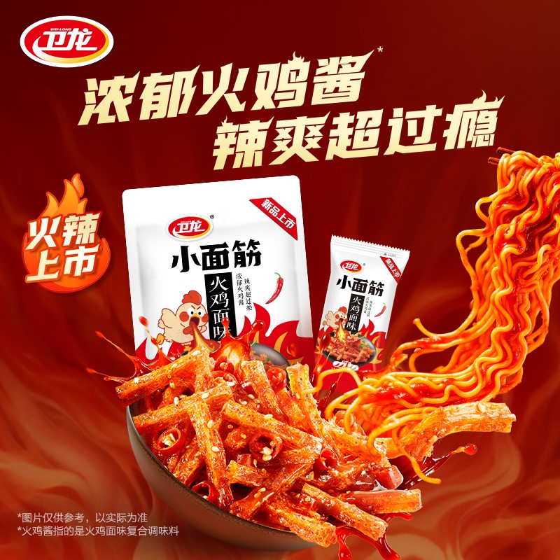 海带产品也是同样的逻辑。风吃海带在2025年推出清爽酸辣味新品,继续强化“低脂低卡、脆爽解馋”的产品定位,与魔芋一起形成蔬菜制品的双轮驱动。与此同时,卫龙也没有忽视面制品的基本盘,而是继续通过新品维持它的活力。例如2025年,它先后推出麻辣牛肉风味亲嘴烧、麻辣小龙虾味辣条,近期还上线了具有极高讨论度的火鸡面味辣条,继续向更丰富的辣度和风味延展。