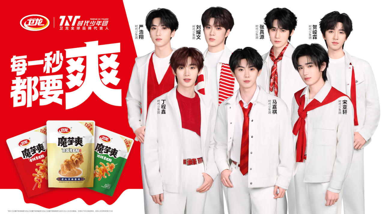 时代少年团则是这样的角色。时代少年团由马嘉祺、丁程鑫、宋亚轩、刘耀文、张真源、严浩翔、贺峻霖七位成员组成,从品牌合作逻辑看,卫龙请来这支团体的意义并不只是带来流量。作为Z世代偶像代表,时代少年团具备鲜明的青春感和圈层影响力,这些特质与卫龙当下想强化的品牌方向高度贴合。
