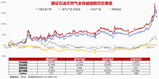 国证石油天然气指数自2021以来的长期表现突出,收益和回撤等多项指标相较同类指数亦有优势。2021年1月4日至2026年3月31日期间,国证石油天然气全收益指数年化收益率为19.65%,明显高于油气产业指数17.76%的同期收益率,且大幅跑赢沪深300指数-0.64%的同期收益率,体现出能源周期上行阶段较强收益弹性;同期该指数最大回撤为-27.82%,明显小于沪深300指数的-41.56%,显示在市场下行阶段具备较强抗跌能力;该指数同期夏普比率为0.96,与同类油气指数及沪深300指数相比,风险收益比表现更优。