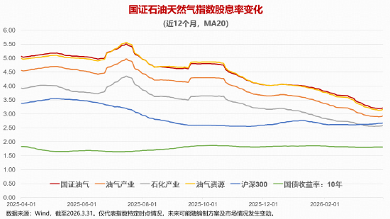 国证石油天然气指数历史走势与油价高度相关,与布油价格走势整体同步,油价下行阶段指数表现承压,而近期油价回升带动指数明显修复。我国能源安全政策推动长期资源开发投入,同时央企高分红策略吸引长期资金配置,使油气板块逐步呈现“周期属性弱化、红利属性增强”的特征。截至2026年3月31日,国证石油天然气指数近12个月股息率约为3.32%,明显高于沪深300指数及石化产业指数,在主要能源指数中处于较高区间。在当前利率维持低位、资金偏好高股息资产的环境下,具备分红优势与行业资源禀赋的国证石油天然气指数,仍有望持续提供具有吸引力的现金回报。