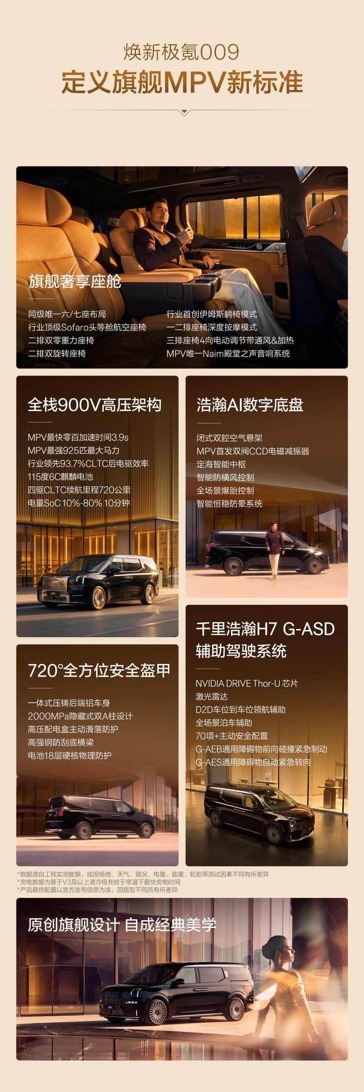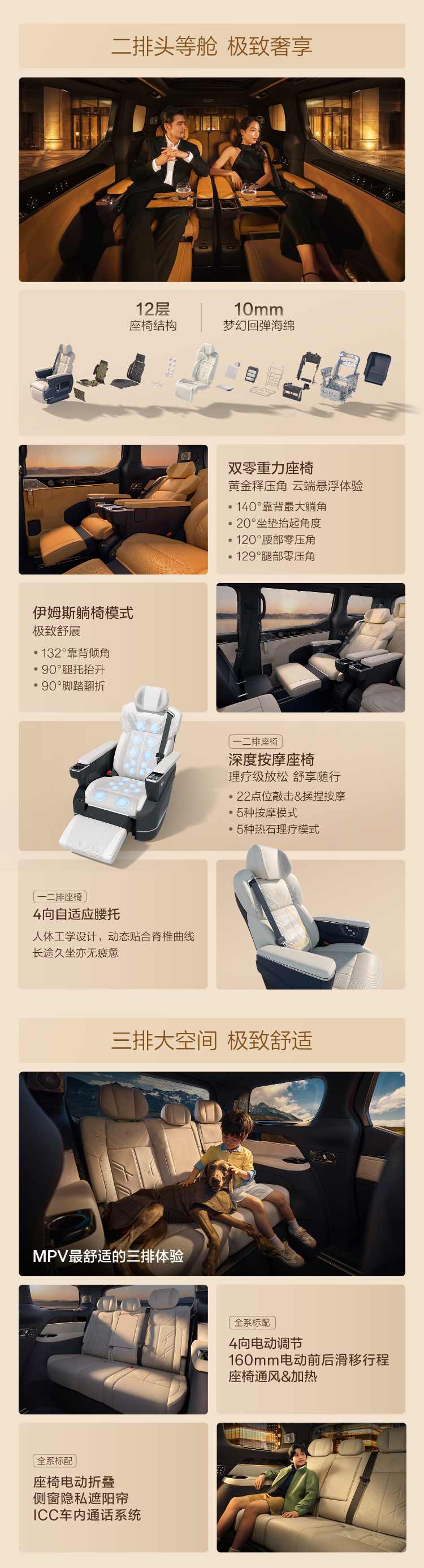 座舱层面,六座行政版配备Sofaro头等舱航空座椅及双零重力座椅,支持140°靠背躺角,行业首创伊姆斯躺椅模式(132°靠背+90°腿托+90°脚踏)。二排提供22点位按摩、5种热石理疗。