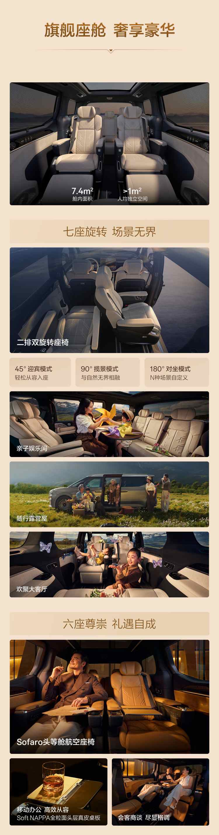 七座齐家版则主打*二排双旋转座椅,支持45°迎宾、90°揽景、180°对坐,可切换亲子露营等场景。全车使用SoftNAPPA全粒面头层真皮,配7.2.7.8沉浸声场、Naim音响及双8295座舱平台。