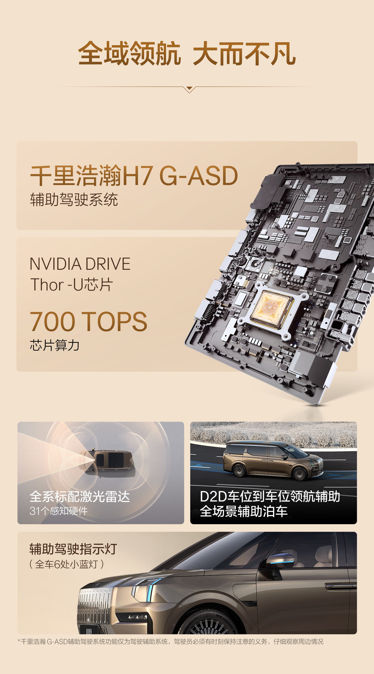 智驾与安全方面,搭载千里浩瀚H7G-ASD系统、NVIDIA Thor-U芯片(700TOPS)、激光雷达及31个感知硬件,支持D2D车位到车位领航辅助、全车6处小蓝灯。