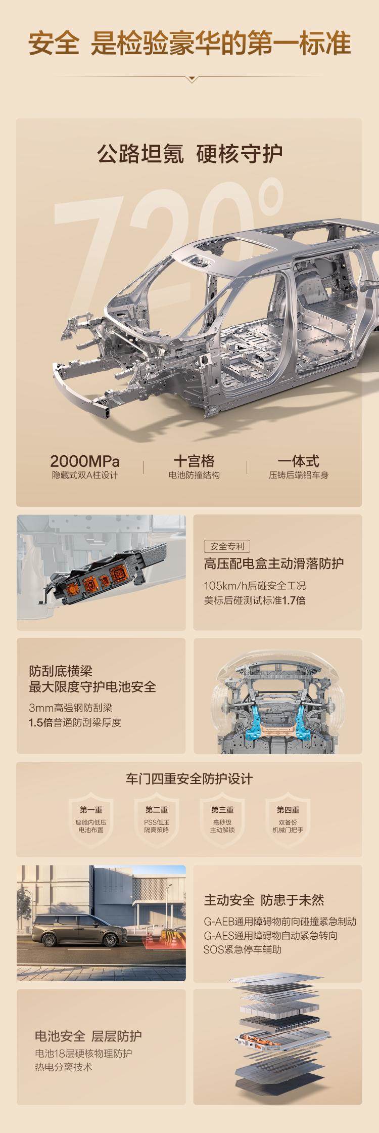 车身延续“公路坦氪”设计:2000MPa双A柱、一体压铸后端铝车身、105km/h后碰标准。电池包新增3mm高强钢防刮梁及18层物理防护,主动安全配置超70项。