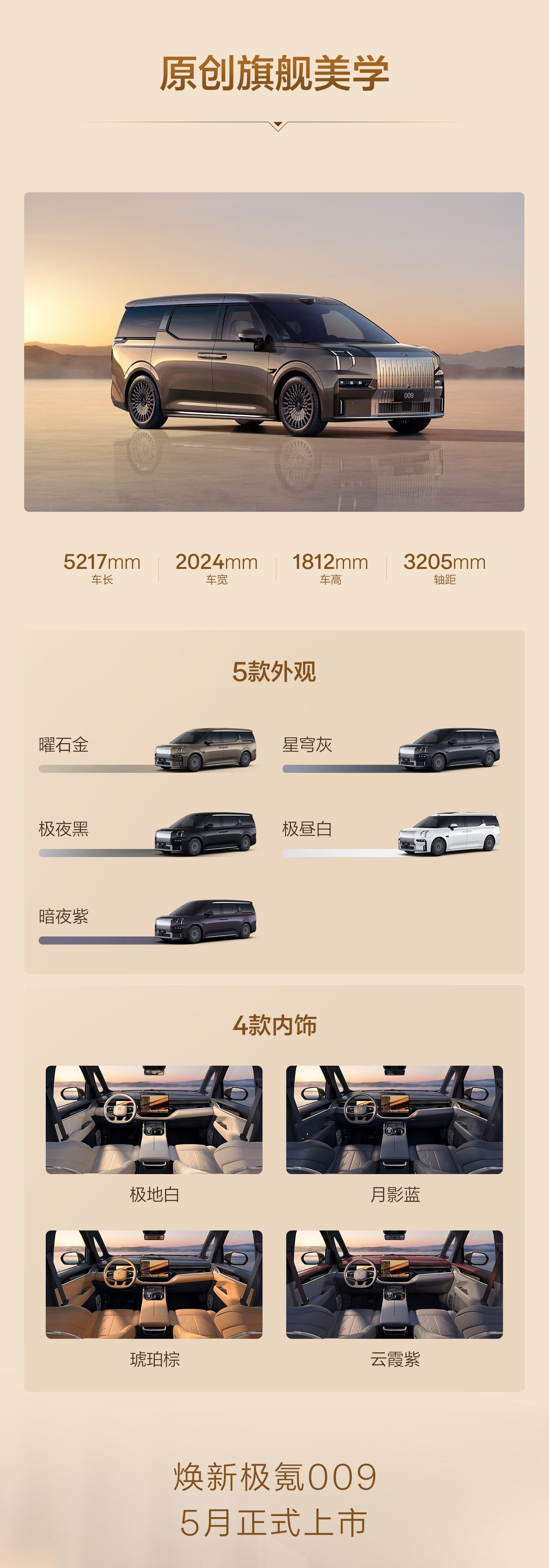 新车长宽高5217/2024/1812mm,轴距3205mm,提供5款外观(曜石金、星穹灰、极夜黑、极昼白、暗夜紫)及4款内饰。官方称“原创旗舰美学”,现已开启预订。