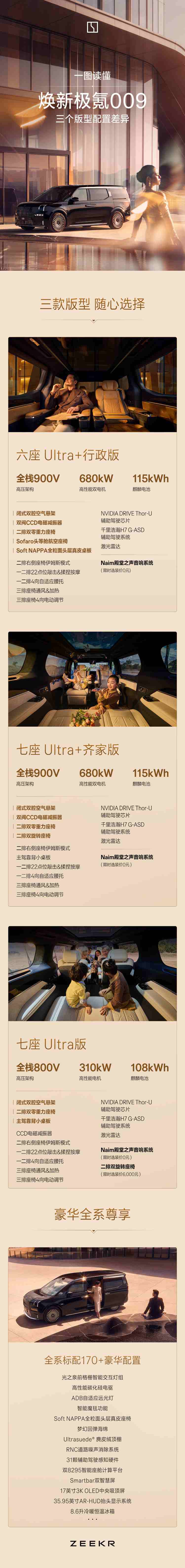 凤凰网科技讯 4月24日,极氪正式发布焕新009,推出七座Ultra版、七座Ultra+齐家版、六座Ultra+行政版三大版型,全系标配全栈900V高压架构,5月正式上市。
