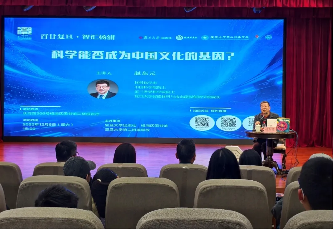 近日,由杨浦区图书馆与复旦大学出版社联合策划的“百廿复旦 智汇杨浦”系列讲座迎来圆满收官。活动特邀材料化学家、中国科学院院士、第三世界科学院院士赵东元教授,以“科学能否成为中国文化的基因”为题,深入剖析科学的本质、中外科学发展的差异及杰出人才培养路径,为现场读者带来深刻启发。