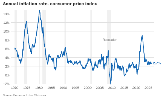 美联储一直致力于在不引发经济衰退的前提下,将通胀率拉回到 2% 的目标水平。尽管新关税政策带来的物价涨幅并未达到许多经济学家的预期,但通胀率依旧顽固难降,2025 年全年始终徘徊在 2.3% 至 3% 之间。